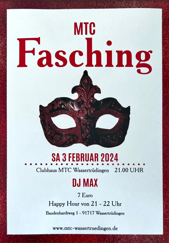 MTC Wassertrüdingen Baudenhardtweg 20, Wassertrüdingen, Bayern, Deutschland🎭 Willkommen zur größten Faschingsparty des Jahres beim MTC Wassertrüdingen! 🎉 Am 03.02.2024 entführt dich unsere Veranstaltung in eine Welt voller Spaß, Musik und fantastischer Kostüme. Sei dabei und erlebe…